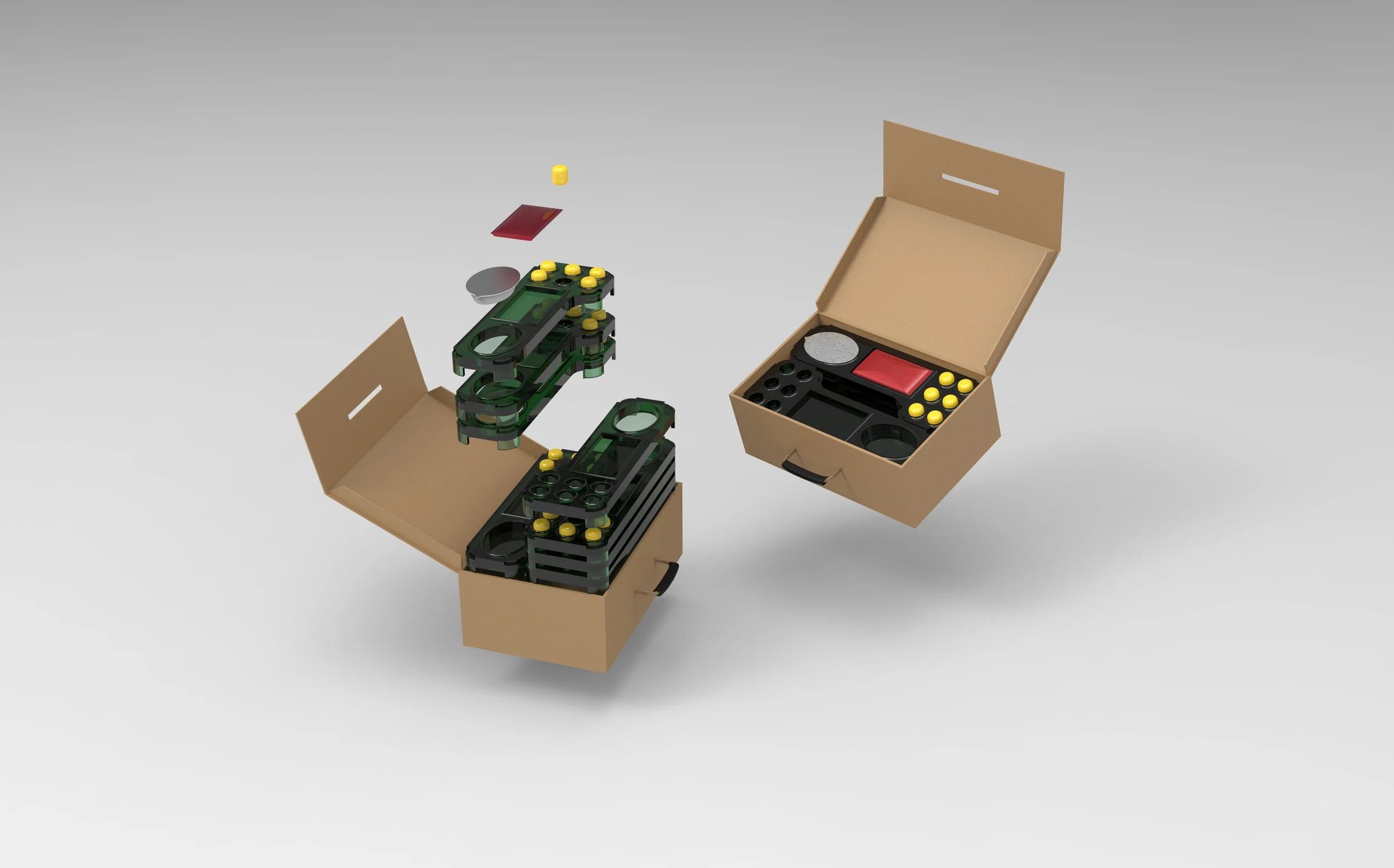 Development focused on refining the tray into a practical, low-cost system. I tested stackability, portioning, and ease of use, ensuring the product felt familiar while remaining efficient. Material research led to PP, PE, PET, cardboard, aluminium, and silicone, chosen for food safety, low price, and automated mass production. Handles and packaging were refined through testing for comfort and storage, aiming for a balance between affordability and dignity in use.