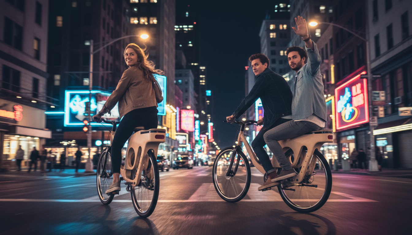 How might I design a legal, sustainable two-person bike that captures the freedom and spontaneity of riding with a friend, while generating its own energy and reducing reliance on plug-in charging?